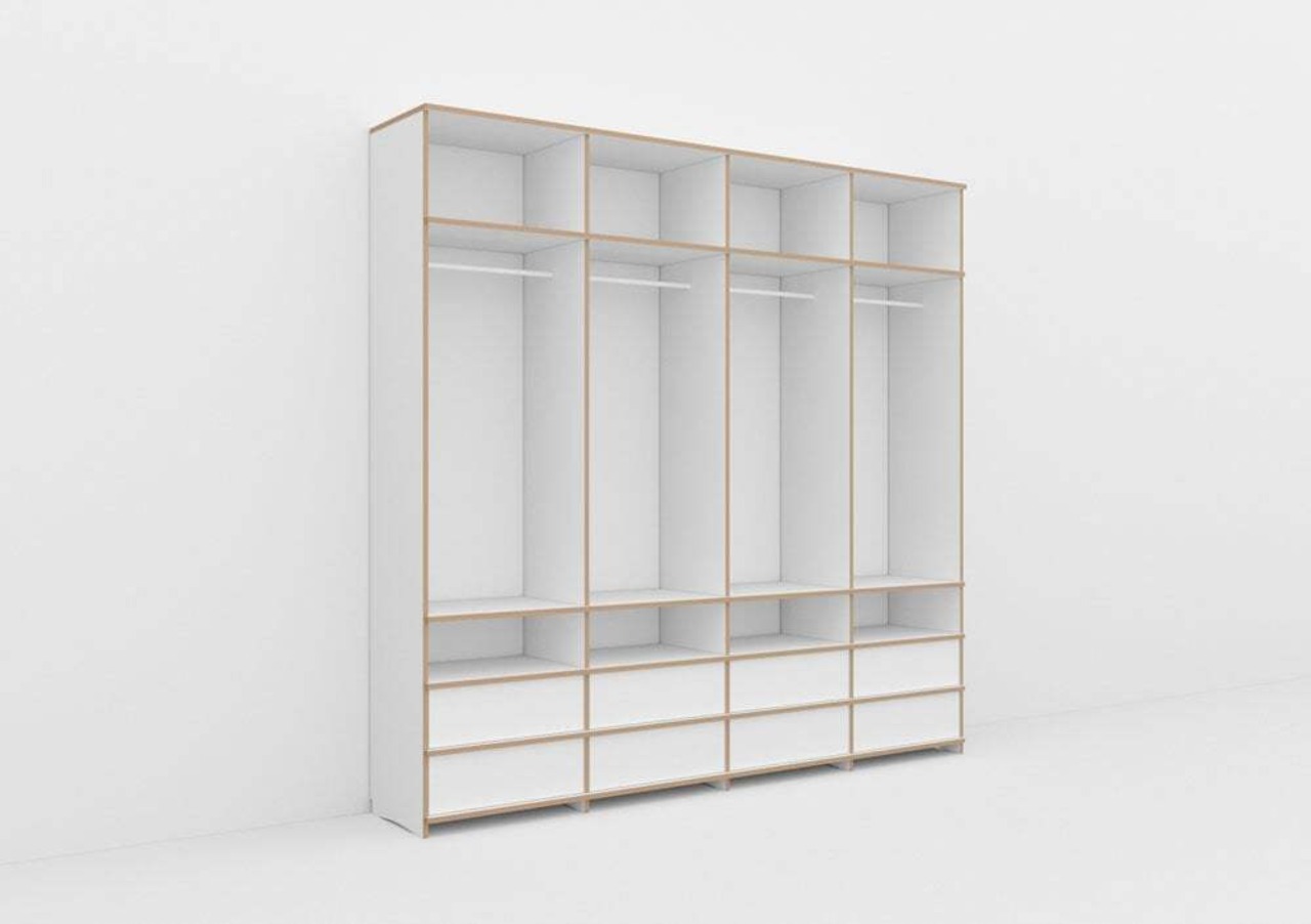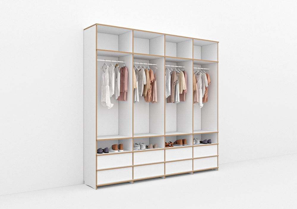 どんなニッチにもフィットし、ドレスの完璧な概要を提供します。すでに4本の洋服レールが計画されています。ドア、フラップ、引き出し、洋服レールをコンパートメントごとに計画できるため、衣類が高貴な雰囲気を醸し出すことができます。