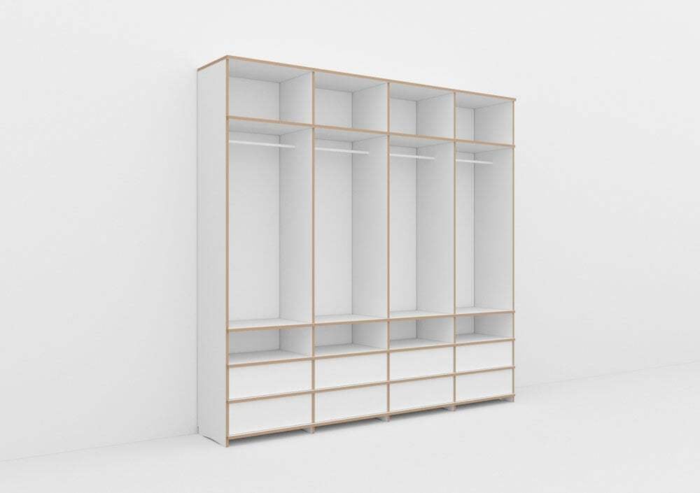 ポールのビルトインワードローブは幅249cm、高さ240cm、奥行き45cmで設計されており、個別にあなたの正確なサイズに合わせて調整可能です。どんなニッチにも合い、あなたのドレスの完璧な全体像を提供します。