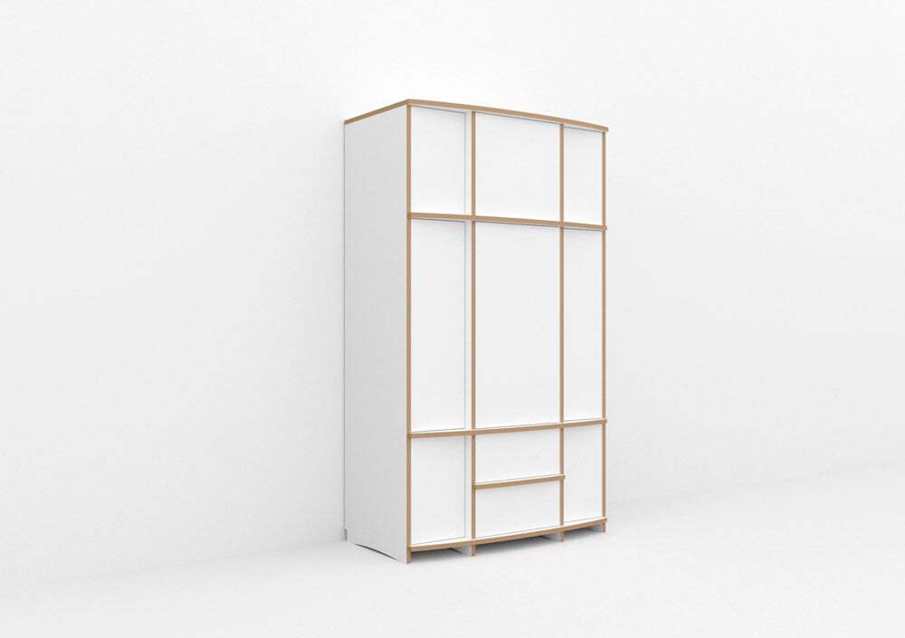 幅104cm、高さ180cm、奥行き58cmの小さくて上質なワードローブは、小さなお部屋やゲストルームに最適です。8つのドア(プッシュ・トゥ・オープン機能付き)、2つの引き出しと1つのクローズレールが素晴らしいレイアウトを作っています。