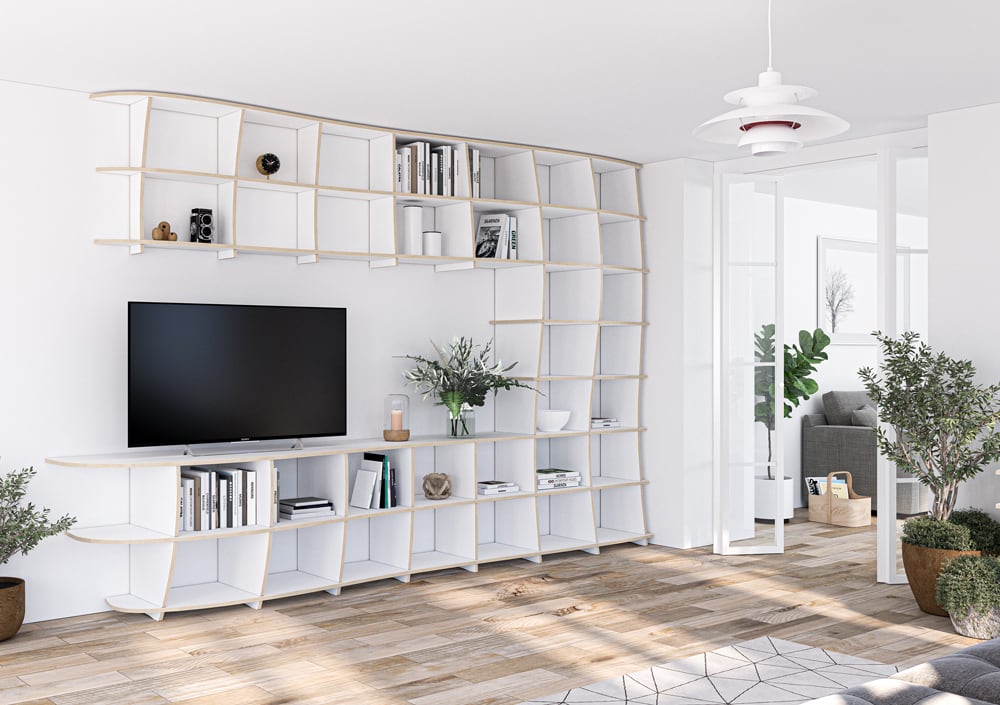 ガラのリビングルームキャビネットは、その雪のように白い見た目で印象的です。不規則に配置された開閉式の仕切りはリビングルームを緩めます。寸法(幅×高さ×幅)は120×200×30cmでカスタマイズ可能です。