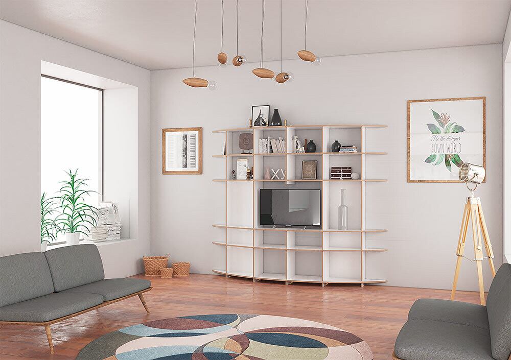 テレビの切り抜きサイズは幅×高さ88cm×61cmで、32インチテレビに最適です。くぼみの隣にある2つの大きな区画は音響システムに特に適していますが、ここで装飾の場面を設定することもできます。上部には8つの収納スペースがあり、本やDVD、Blurayを収納できる十分なスペースがあります。壁掛けユニットは有機的な形状だけでなく、個人の持ち物を置くための広いスペースでも魅力的です。ロンデラは当社の高級素材であるFU Birchの白で製造され、高品質なメラミン樹脂コーティングが施されています。これにより家具は特に頑丈で傷に弱くなります。壁掛けユニットが壁にぴったり収まるように、3Dコンフィギュレーターで重要な寸法をすべてご自宅に合わせて調整できます。