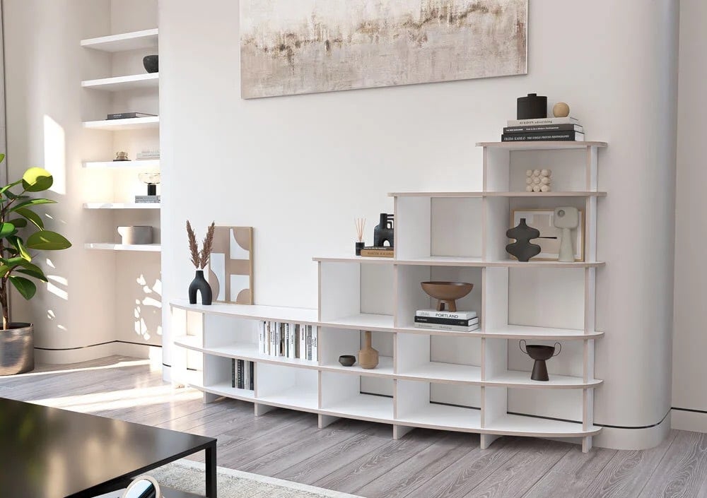 オープンデザインで皆の注目を集め、テレビのローバードとシェルフが一体化しています。全体の寸法は(幅×高さ)300cm×140cmです。家具はフィンランド産のバーチラミネートベニヤ材で作られ、白い高品質のメラミン樹脂コーティングが施されています。もちろん、壁掛けユニットをご自宅に合わせて調整することもできます。「自分で形を整える」オプションに行き、寸法や形状、素材をご希望に応じて変更すればよいのです。