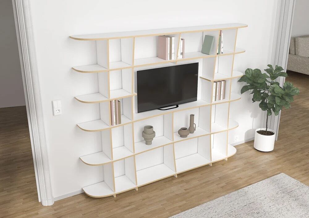 サイズ(幅×高さ)116 cm x 63 cmのテレビ切り抜きは、43インチのテレビを置くのに十分なスペースを提供します。異なるサイズの16個の区画があり、十分な収納スペースを提供します。書籍、DVD、コレクターズアイテムなど、ここではスタイリッシュに展示できます。3Dコンフィギュレーターでは、閉鎖収納スペースを希望する場合はドアやフラップの計画も可能です。ここでは、ご希望やニーズに応じて寸法、形状、素材を調整し、新しいウォールユニットを最適な環境に溶け込ませることができます。Salimaは当社のプレミアム素材であるFUバーチで作られており、高品質で不透明なメラミン樹脂コーティングが施されています。