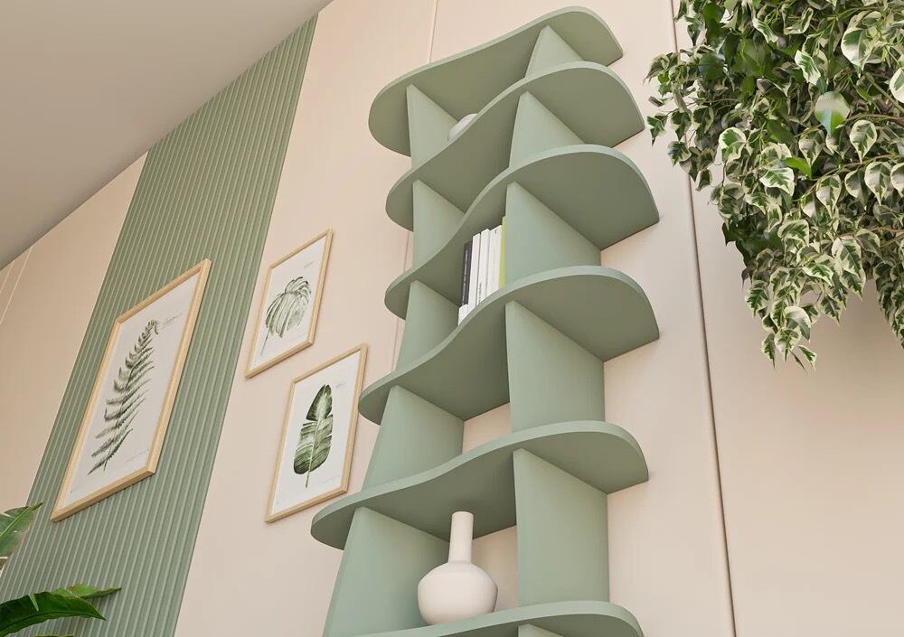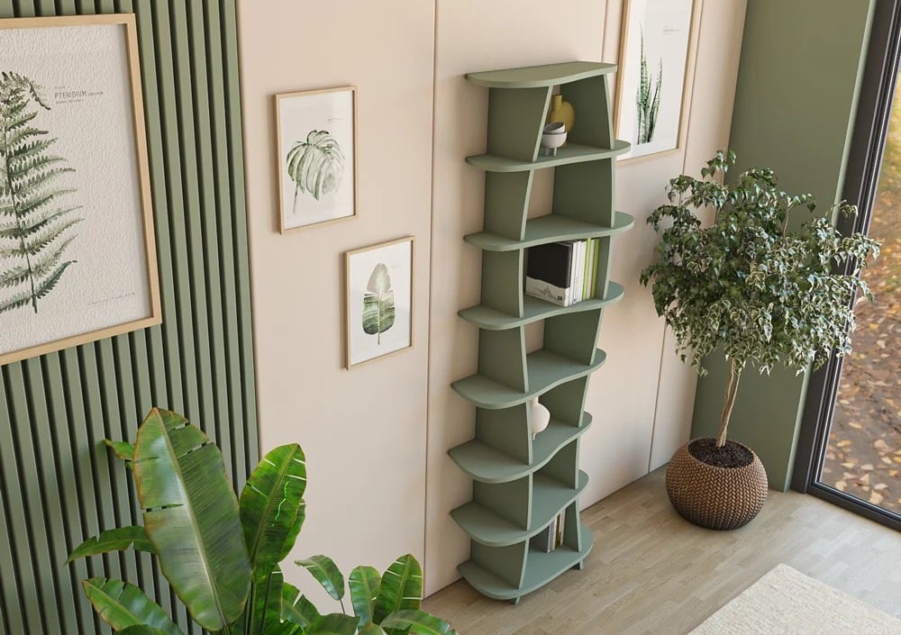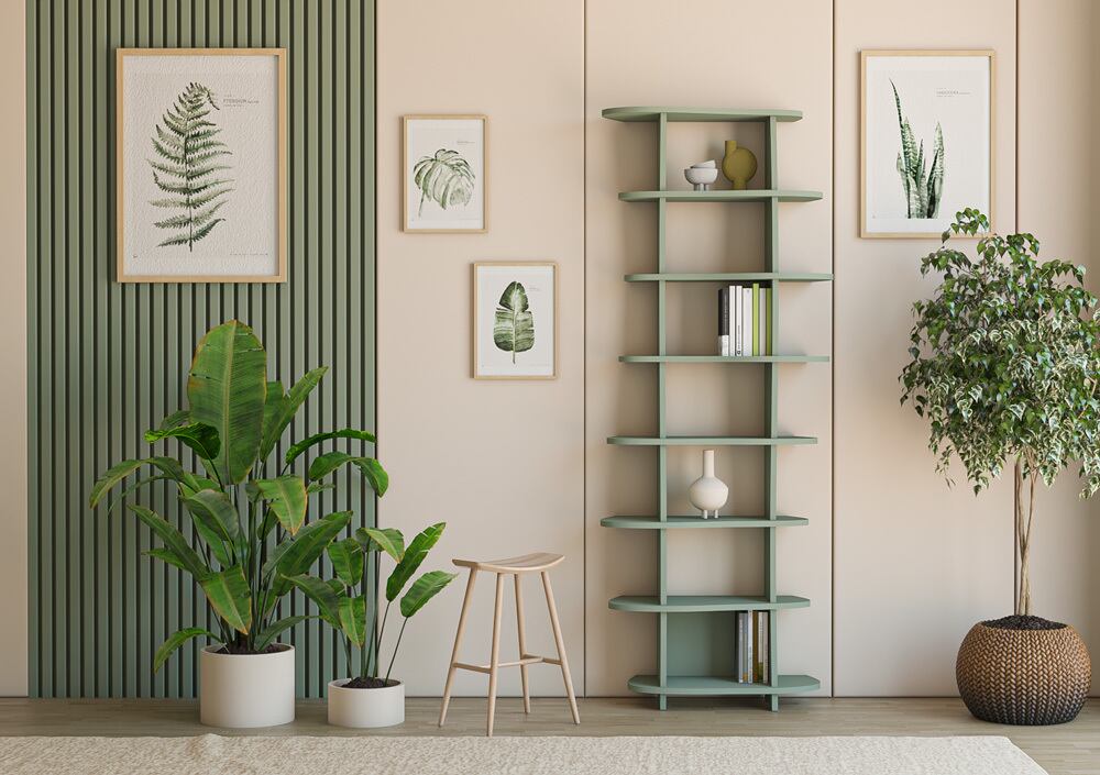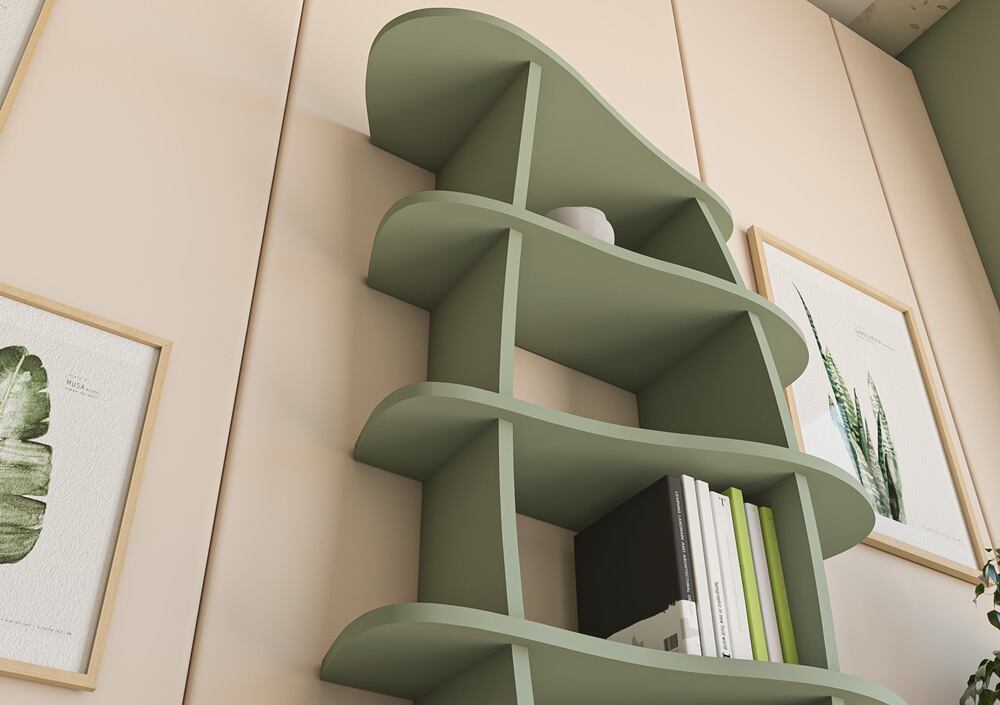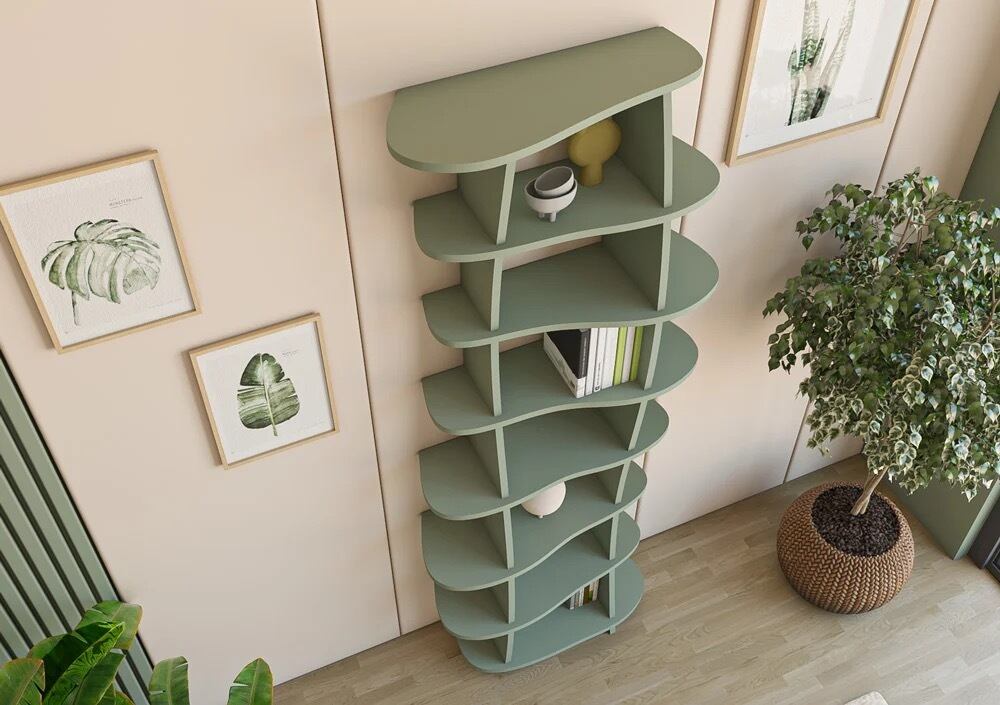 ミラナの本棚は、新鮮な自然さと現代的な優雅さをあなたの家に届けます。曲線的な形状と心地よいユーカリグリーンが、自然なデザインの完璧な組み合わせです。