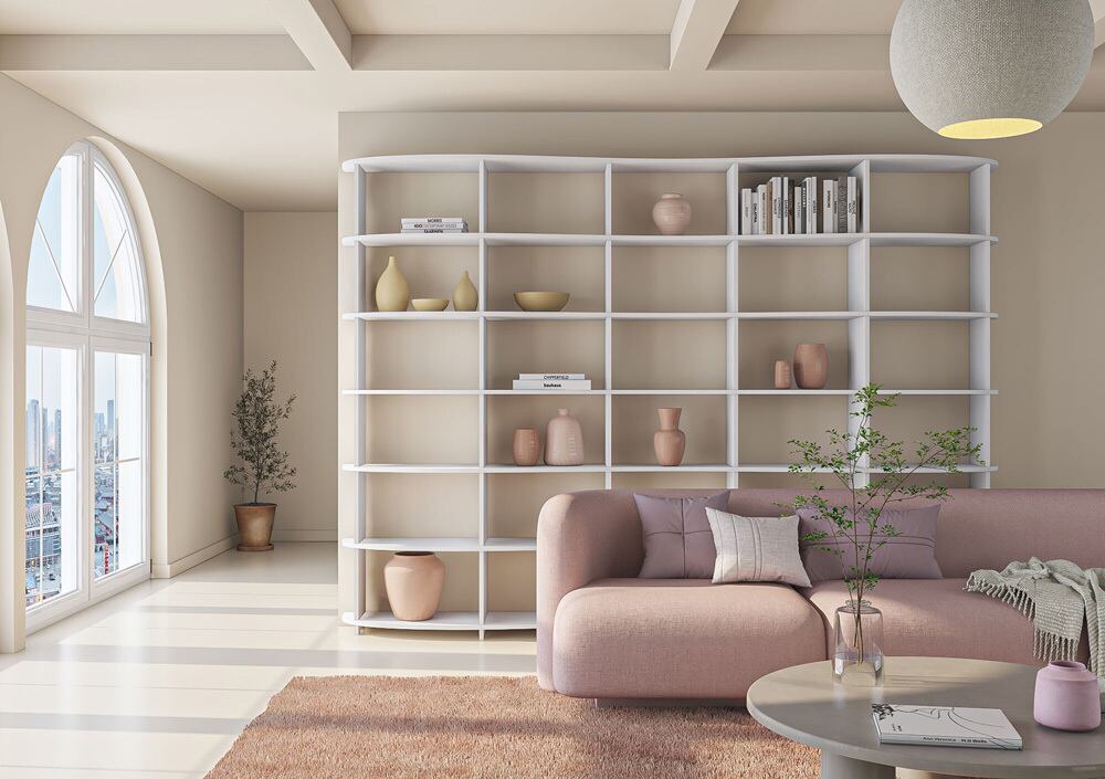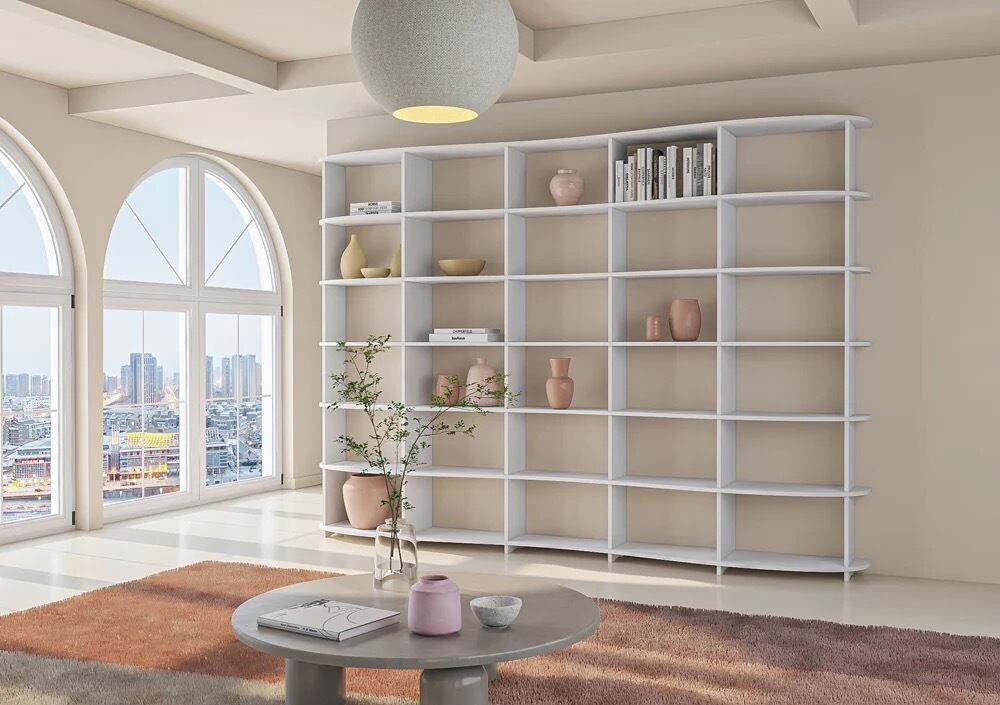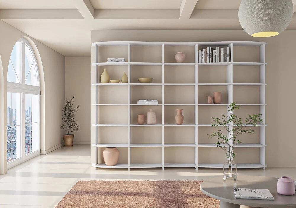ガラのリビングルームキャビネットは、その雪のように白い見た目で印象的です。不規則に配置された開閉式の仕切りはリビングルームを緩めます。寸法(幅×高さ×幅)は120×200×30cmでカスタマイズ可能です。
