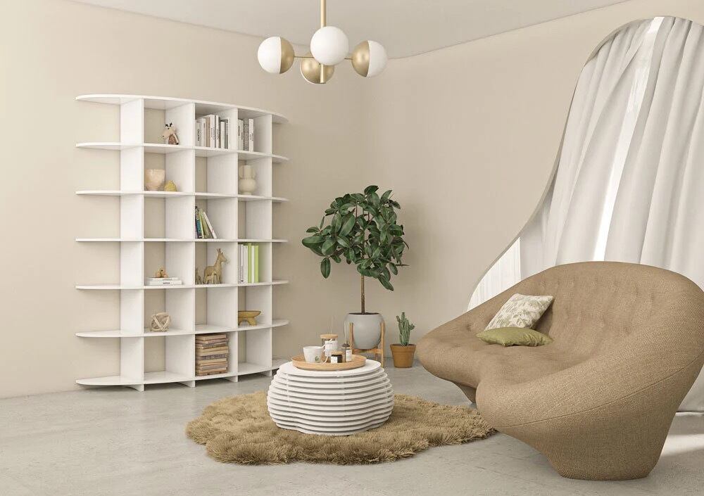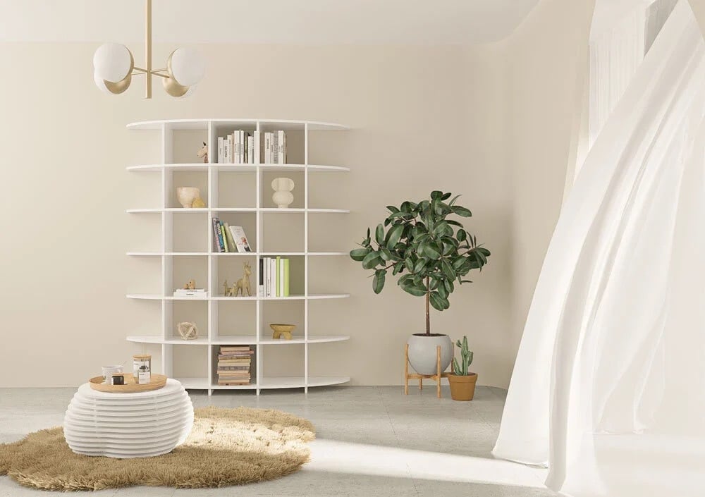 曲線的な形状だけでなく、高貴な色合いによってデザイナーシェルフは特別なアクセントを演出し、皆の注目を集めます。また、ロンダは十分な収納スペースも備えており、すべての本愛好家にぴったりです。シンプルなプラグインシステムのおかげで、棚をすぐにセットアップできます。
