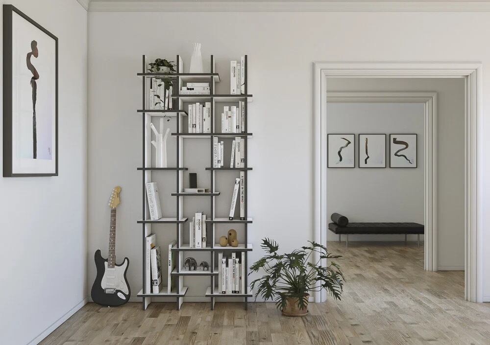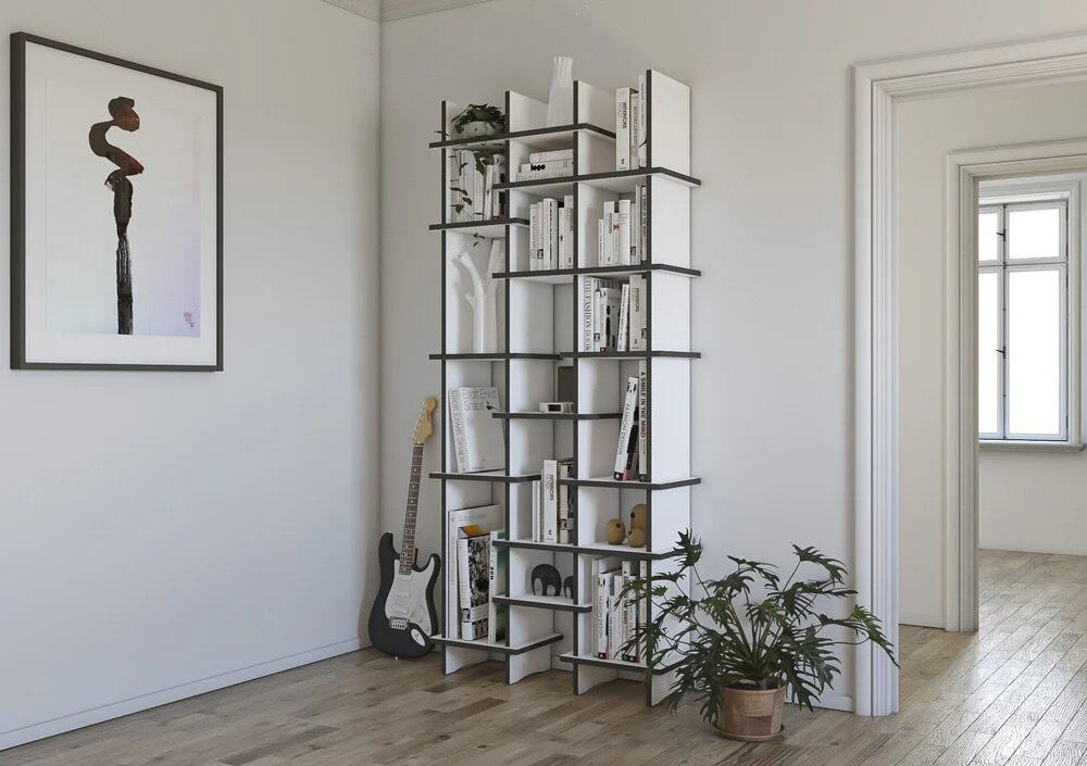 白黒の現代的な色のミックスと独特な配置が、ピエタの本棚を唯一無二のものにしています。仕切りのサイズが異なるため、遊び心のある印象を残すだけでなく、好みに合わせて家具を用意することも可能です。