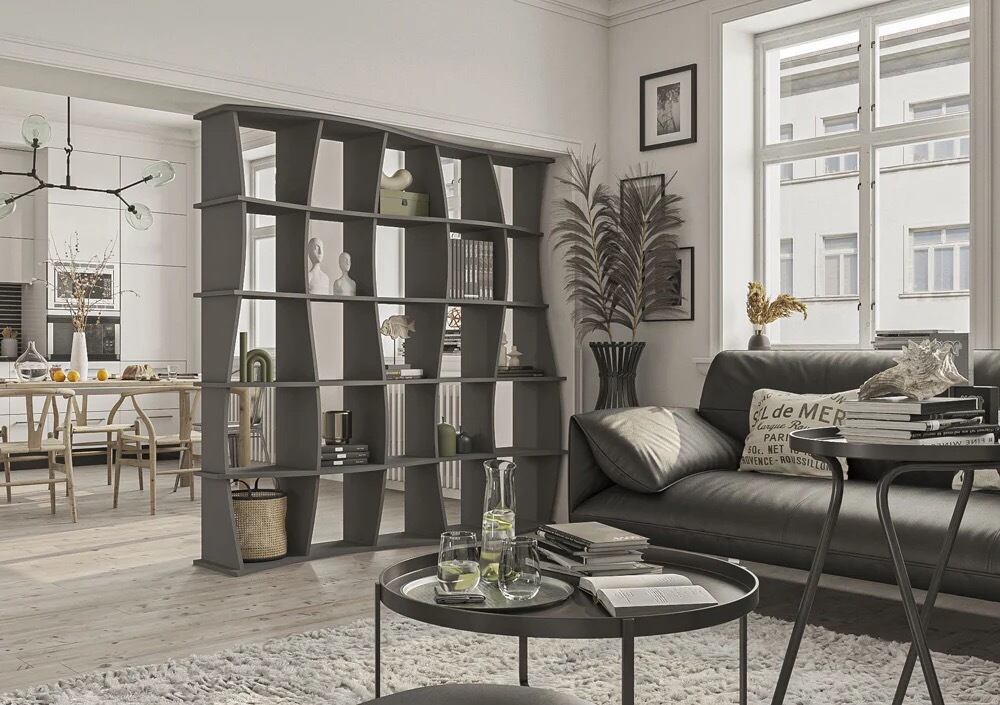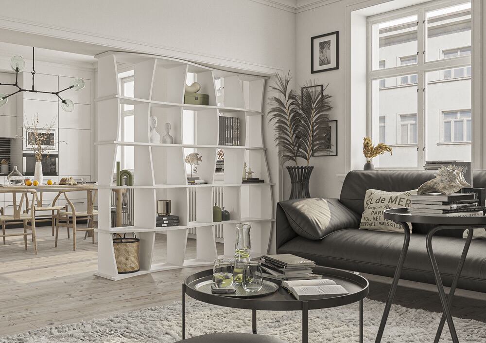 ガラのリビングルームキャビネットは、その雪のように白い見た目で印象的です。不規則に配置された開閉式の仕切りはリビングルームを緩めます。寸法(幅×高さ×幅)は120×200×30cmでカスタマイズ可能です。