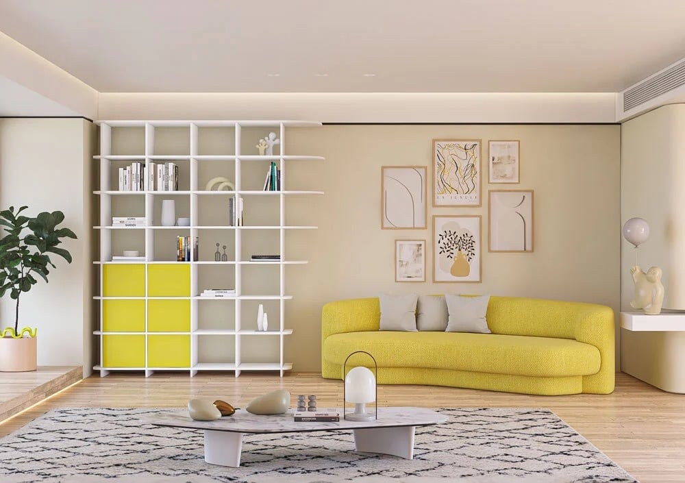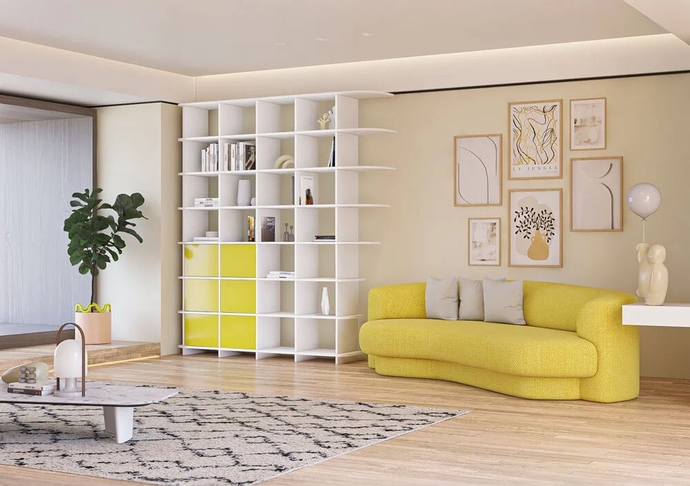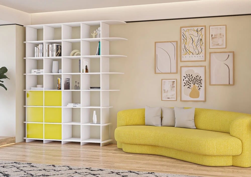 ガラのリビングルームキャビネットは、その雪のように白い見た目で印象的です。不規則に配置された開閉式の仕切りはリビングルームを緩めます。寸法(幅×高さ×幅)は120×200×30cmでカスタマイズ可能です。